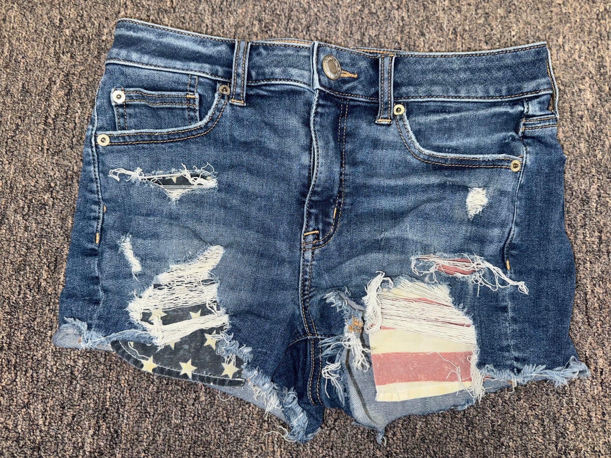American Eagle (6) Distressed Denim USA Pattern Pockets Hi-Rise Shortie Shorts
