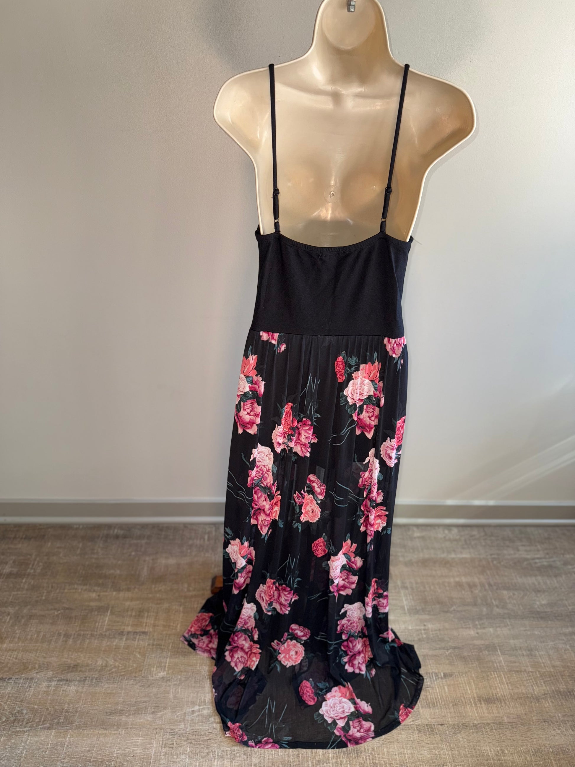 -Black Romper with Sheer Floral Wrap making it a dress