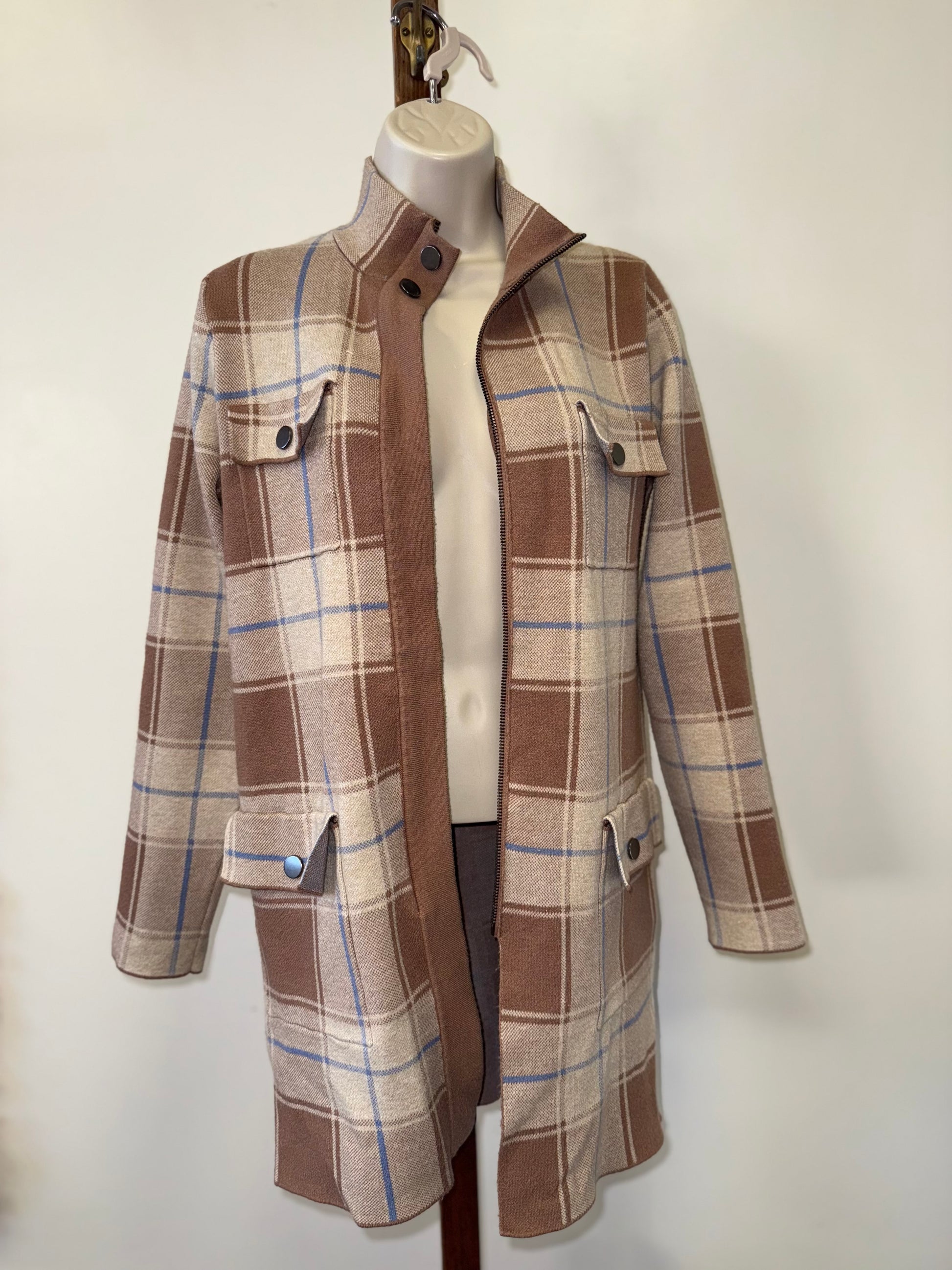 Max Studio (Large) Brown//Blue Plaid Zip Up Trench Coat