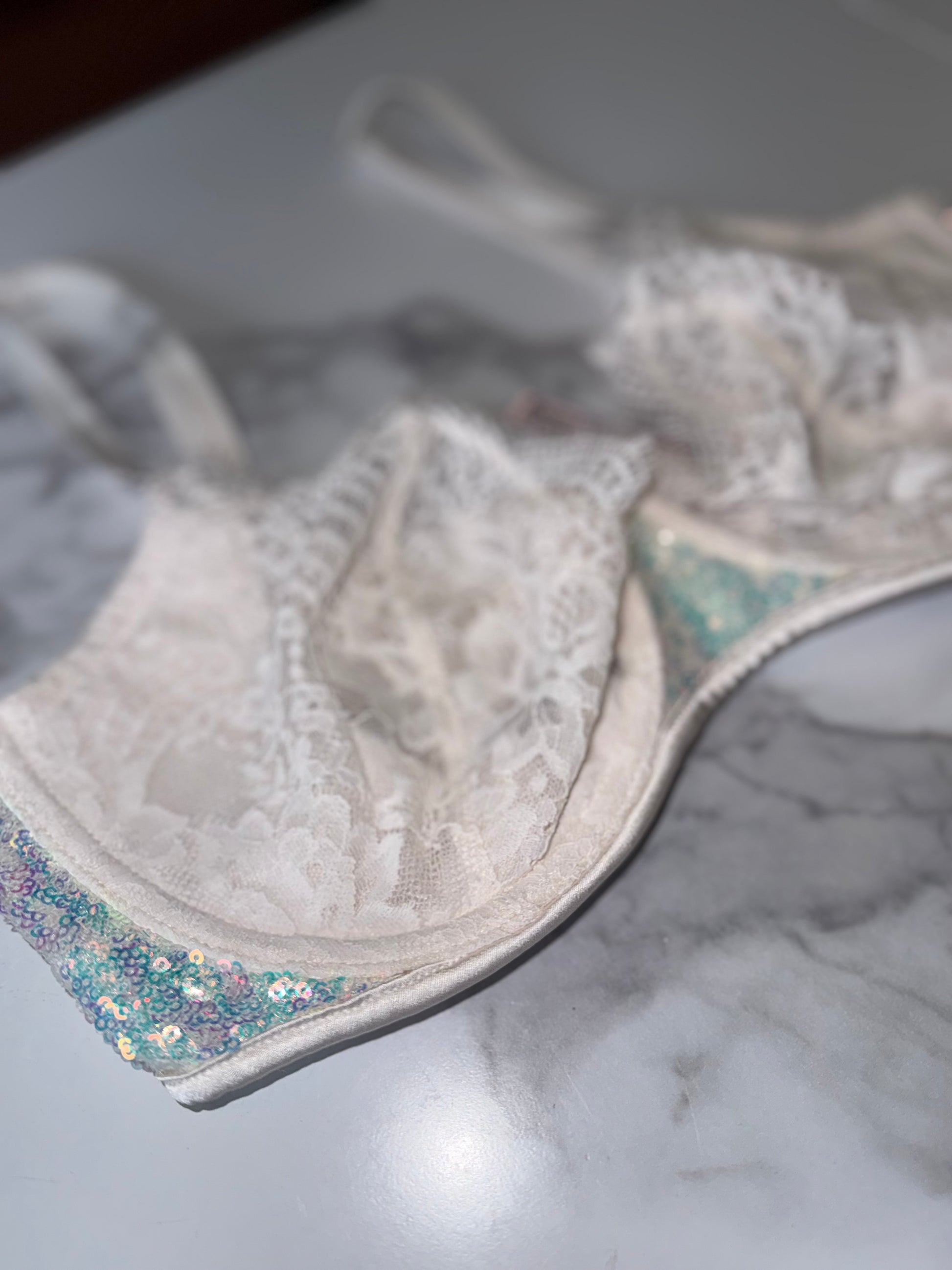 Victoria's Secret (34DD) White Lace Dream Angels Push Up Bra W/ Metallic Sequins